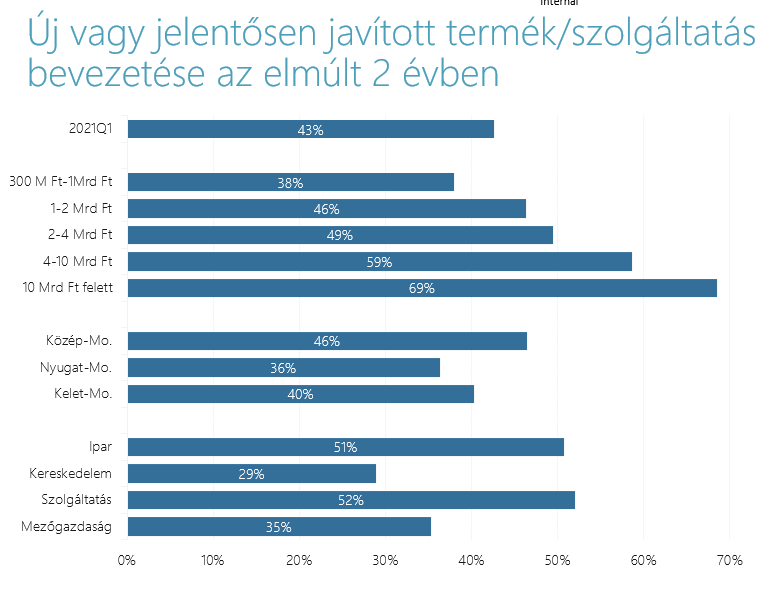 A megkérdezett vállalatok 43 százaléka hajtott végre az elmúlt két évben olyan innovációt, amelynek keretében új szolgáltatással vagy termékkel bővítette a kínálatát. A cégméret alaposan szétszórta a mezőnyt. A 10 milliárd forintot meghaladó vállalatok közül 100-ból 69-nél volt ilyen innovatív fejlesztés.
