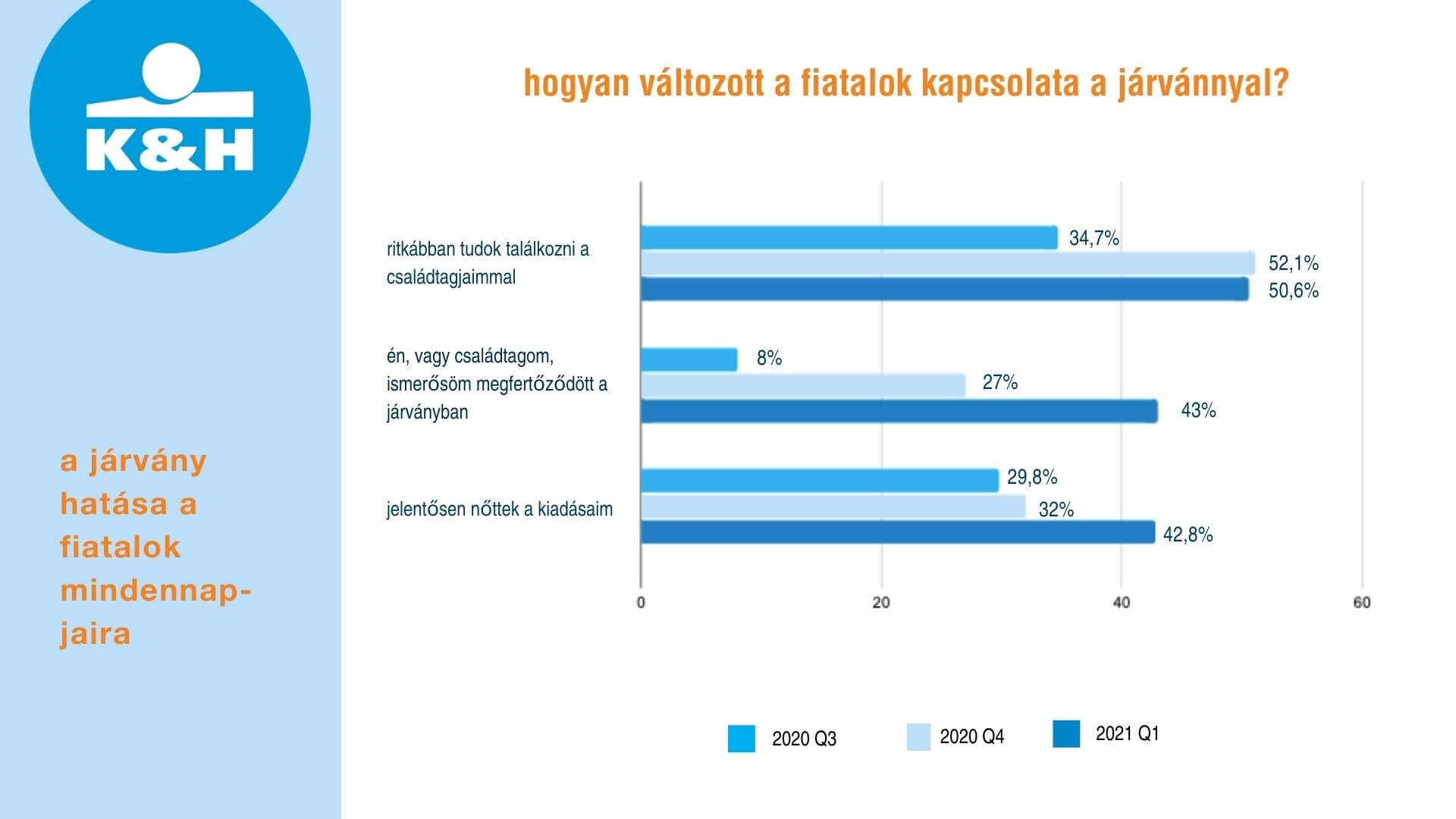 A felmérés szerint az érintett fiatalok több mint 50 százaléka az idei első negyedévben és a múlt év utolsó három hónapjában is ritkábban találkozott a családtagokkal, míg 2020 harmadik negyedében ez csak a 35 százalékukra volt igaz. A K&H ifjúsági indexe szerint a nők 58 százalékára volt ez jellemző az idei első negyedévben, a férfiak körében azonban csak 43 százalékos volt az arányuk.
