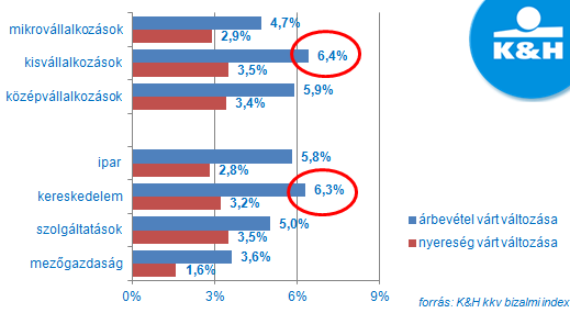 A különböző árbevételű cégek igen eltérő mértékű bevétel-növekedést várnak idén. Jelenleg a kisvállalkozások számítanak a leglátványosabb, 6,4%-os árbevétel-növekedésre, de a középvállalkozások sincsenek nagyon lemaradva az 5,9%-os várakozásukkal, míg a mikrovállalkozások átlag alatti, 4,7%-os bővülést valószínűsítenek. A különböző ágazatok közül a kereskedelmi cégek várakozásai a legkedvezőbbek, hiszen 6,3%-os növekedést prognosztizálnak.