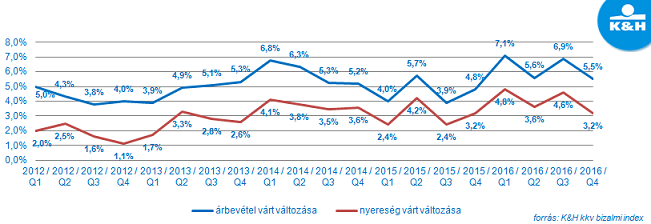 Visszafogottabb pénzügyi várakozással indítják az évet a hazai kkv-k, idén átlagosan 5,5%-os árbevétel és 3,2%-os profitnövekedést valószínűsítenek – derül ki a K&H kkv bizalmi index kutatás legutóbbi adataiból. Pénzügyeik idei alakulását tekintve a kisvállalkozások a legoptimistábbak.