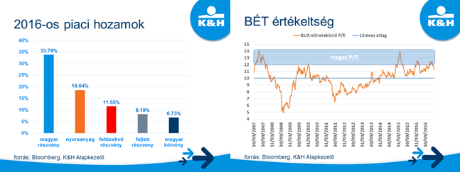 „Az emelkedő trend idei visszatérésére a külföldi elemzői várakozások szerint ugyan van esély, rövid távon azonban ennek két akadályát látjuk: egyrészt a BUX mintegy 95%-át kitevő hazai blue chipek (OTP, MOL, Richter, Telekom) igen óvatos éves profitvárakozásokat fogalmaztak meg a negyedéves jelentésük után, ami nem kápráztatta el a befektetőket. Másrészt a magyar tőzsde egyik legfontosabb árazási mutatója, az árfolyam/várható eredmény ráta (P/E) 12,5 pontot ért el 2017elején, ami a magyar tőzsde vonatkozásában történelmileg igen magas értékeltséget mutat.Mivel a régióban éles verseny van a befektetőkért, így azok – értehető módon – az olcsóbb és/vagy jobb profitnövekedéssel bíró piacokra térnek át” – mondta el Kovács Mátyás. Ez alapján rövid távon nem tartjuk vonzónak a hazai részvénypiacot. A pozitív fordulathoz tartósan optimista hangulatra és a hazai blue chipek részéről új növekedési sztorira van szükség” – tette hozzá a szakember.