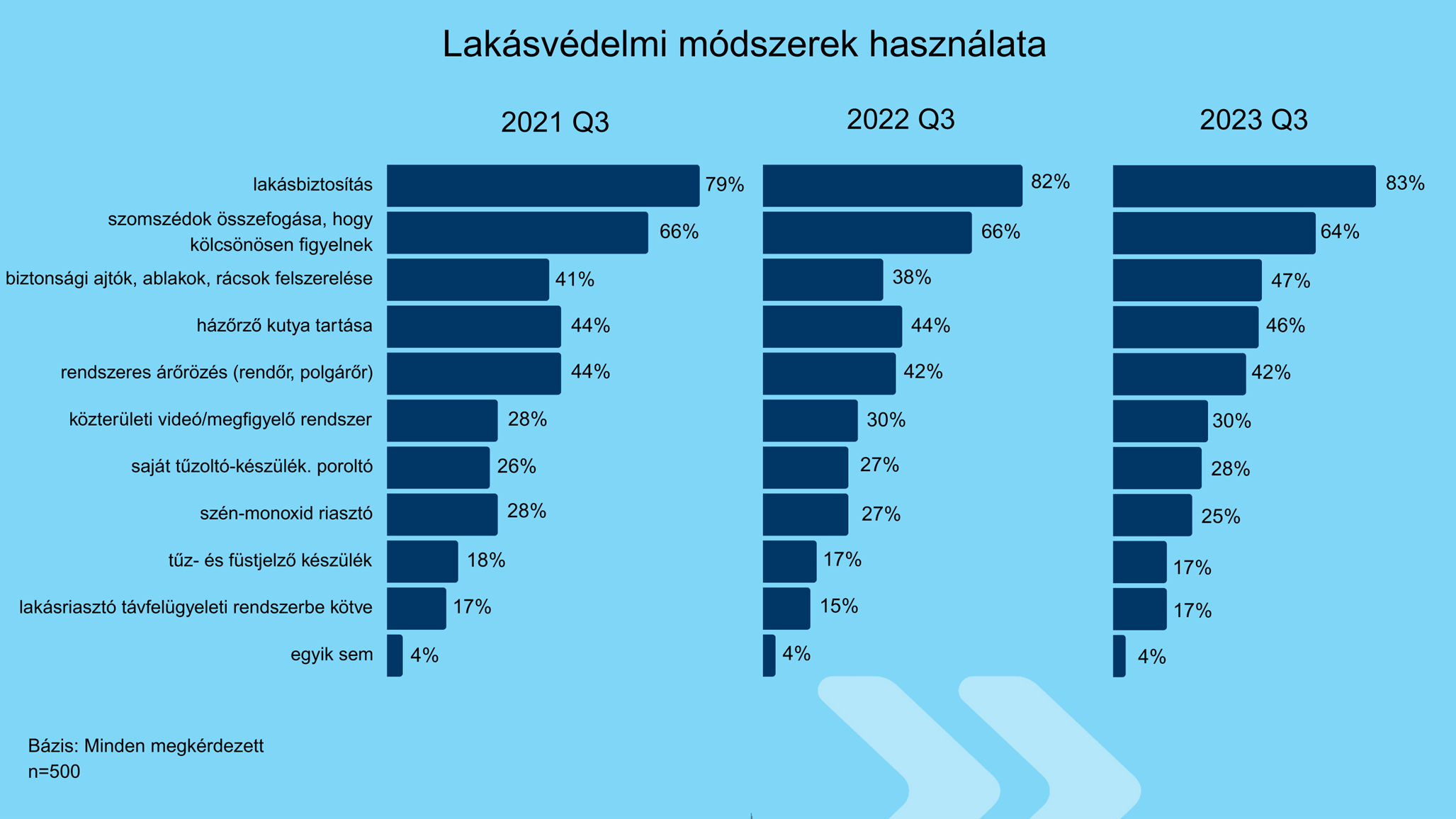 A lakásbiztosítás mellett sokan más megoldásokkal is igyekeznek vigyázni az otthonaikra. A megkérdezettek 64 százaléka a szomszédokkal összefogva figyelik egymás ingatlanait. 47 százalékos azoknak az aránya, akik biztonsági ajtókkal, ablakokkal tartják távol a betolakodókat - arányuk jelentősen nőtt a korábbi évekhez viszonyítva, 2021-ben és 2022-ben 41 és 38 százalékuknak volt ilyen védelme. A házőrző kutyák aránya évek óta valamivel 40 százalék felett van a kutatás szerint.