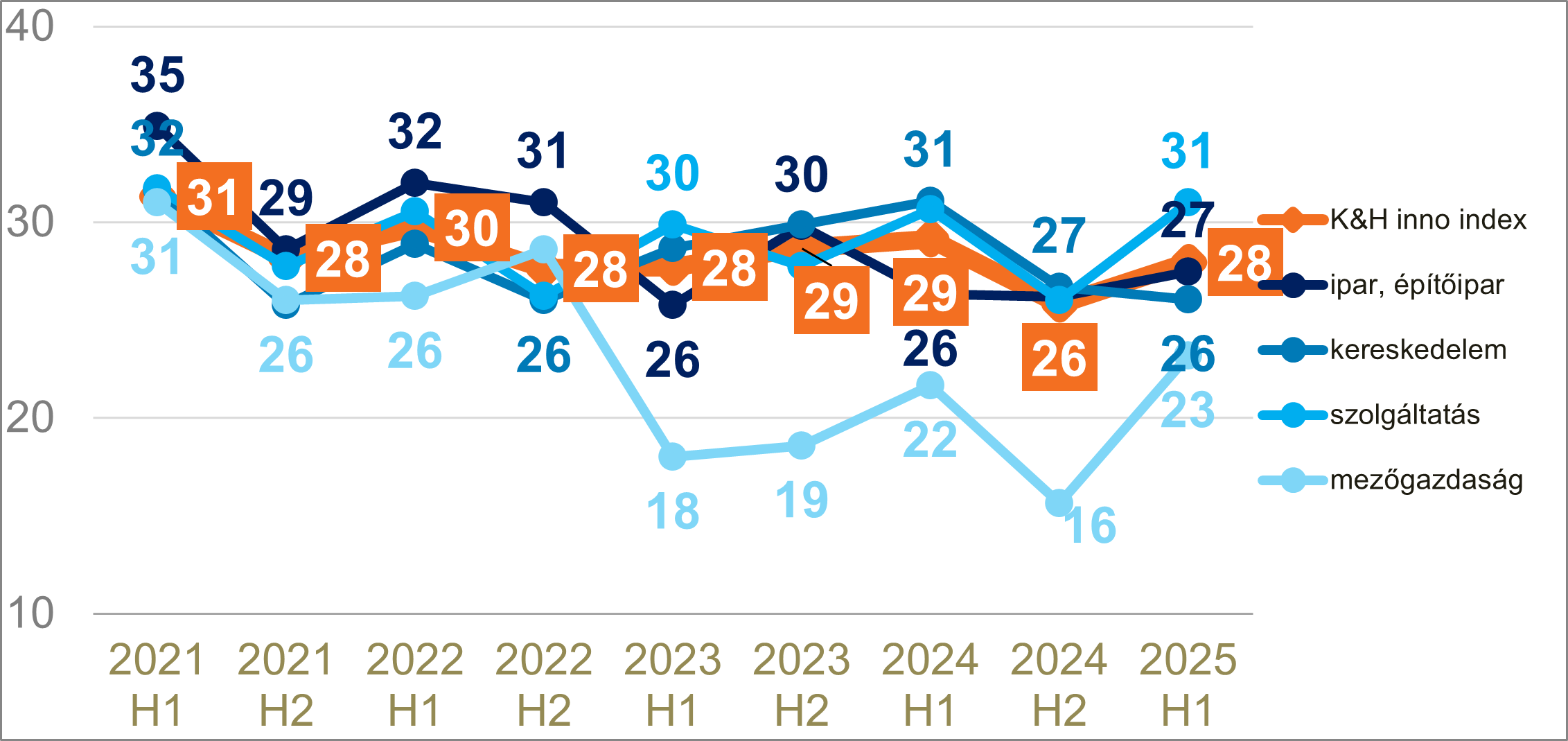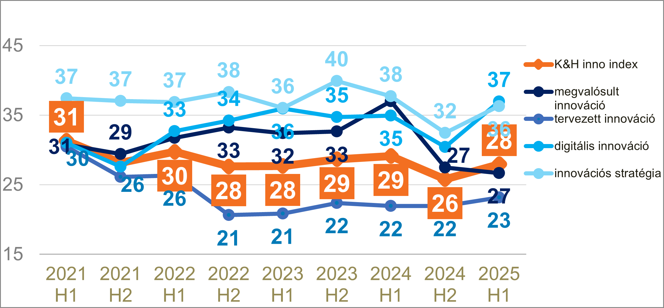 Kétpontos növekedéssel 28 pontra emelkedett a K&H innovációs index értéke 2025 első félévében. A hazai, 300 millió forint feletti árbevétellel rendelkező vállalatok innovációs aktivitását mérő mutató ezzel továbbra is az alacsony kategóriában marad, ugyanakkor az elmúlt időszak visszaesése után az index visszakorrigált - különösen a digitális fejlesztések és a stratégiai tervezés terén, köszönhetően a kis- és közepes cégek innovációs tevékenységének.