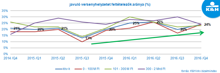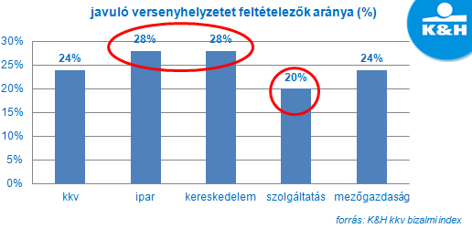 A K&H kkv bizalmi index félezer hazai kkv-t kérdezett meg arról, hogyan alakulhat idén versenyhelyzete konkurenseihez képest. A közel másfél évvel ezelőtti mélypontot követően egyre több vállalkozás bízik javuló versenyhelyzetében. „A cégvezetők nyilatkozatai alapján azt látjuk, hogy a vállalkozások stabilnak vélik piaci pozíciójukat, hiszen döntő többségük (71%) szerint nem változik versenyhelyzetük versenytársaikkal szemben a következő egy év során. A javuló versenyhelyzetre számítók aránya azonban kismértékben, 20%-ról 24%-ra nőtt, tehát közel minden negyedik kkv véli úgy, hogy idén erősödhetnek konkurenseikkel szemben” – mondta el Kovács Viktor Zoltán, a K&H kkv marketing főosztály vezetője. A Világgazdasági Fórum legutóbbi versenyképességi rangsora alapján van még hova fejlődnünk, hiszen Magyarország világviszonylatban a 69., a 28 tagból álló Európai Uniós országok között pedig a 25. helyen szerepel.