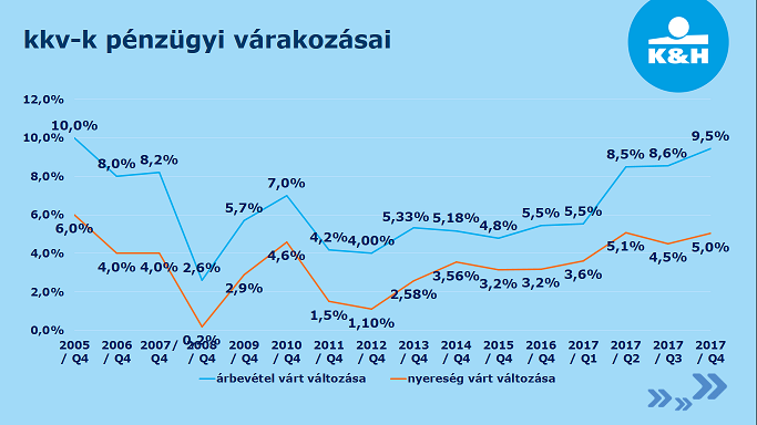 Úgy tűnik, nem lesznek idén anyagi gondjaik a hazai cégeknek. „Igen jó év elé nézhetnek a vállalkozások, ugyanis a K&H kkv bizalmi index kutatásunk legutóbbi adatai szerint jelenleg átlagosan 9,5%-os árbevétel-növekedést és 5%-os nyereségbővülést valószínűsítenek idén a hazai mikro-, kis- és középvállalkozások. Az árbevételt tekintve több mint 10 éve nem vártak ilyen magas növekedést a cégek, a nyereségbővülés várt mértéke pedig az előző negyedévi visszaesést követően visszakorrigált egy kedvezőbb szintre” – részletezte az eredményeket Kovács Viktor Zoltán, a K&H kkv marketing főosztály vezetője.