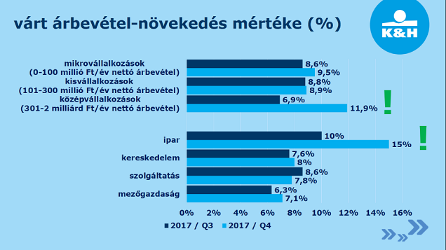 A cégmérettel párhuzamosan a várt árbevétel-növekedés is egyre nagyobb. Jelenleg a középvállalkozások a legoptimistábbak, ugyanis 5 százalékponttal 11,9%-ra ugrott a várt bővülés mértéke. A mikrovállalkozások várakozásai ennél szerényebb mértékben, 8,6%-ról 9,5%-ra nőttek, míg a kisvállalkozások várakozásai gyakorlatilag nem változtak (8,9%). A különböző ágazatok közül az ipar cégek kilátásai a legkedvezőbbek, hiszen 15%-os növekedést valószínűsítenek.