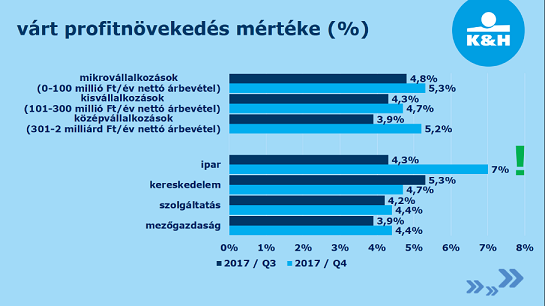 A profitkilátásokat tekintve már nem érvényes a nagyobb cég, nagyobb várakozások elv, itt ugyanis a legkisebb cégek a legoptimistábbak: a mikrovállalkozások átlagosan 5,3%-os nyereségnövekedéssel számolnak. Tőlük épp hogy lemaradva a középvállalkozások vannak, ők 5,2%-os, a kisvállalkozások pedig 4,7%-os profitnövekedéssel terveznek idén. A szektorok közül a profitot tekintve is az ipari cégek a legoptimistábbak, és egyedül ők várnak átlag feletti, 7%-os nyereségbővülést az előttünk álló egy évben.