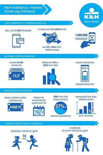 Megközelítette a 4 milliárd forintot a mobiltárcás költések összege a K&H-nál a 2017 novemberi indulás óta eltel 15 hónapban. Ráadásul az aktív mobiltárcás ügyfelek a kártyás vásárlásaik több mint felét fizették okostelefonjukkal. A K&H mobiltárcásai havonta átlagosan 54 ezer forintot, egy-egy vásárlásnál pedig átlagban 4488 forintot költöttek. Az ügyfelekre jellemző egyébként, hogy leginkább 5 ezer forint alatti vásárlásra használják a mobiljukat. A K&H tapasztalatai szerint a mobiltárcás ügyfelek szeretik ezt a megoldást és a jövőben várhatóan egyre többen használják majd a szolgáltatást.