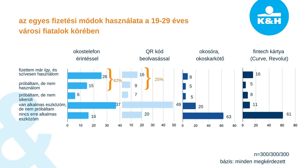 Általában kevesebb, mint a megkérdezett fiatalok fele alkalmazza a legújabb fizetési megoldásokat - derül ki a K&H ifjúsági indexéből. Az okostelefonos érintéses alternatívát csak 26 százalékuk használja rendszeresen, a QR-kódos fizetést pedig 16 százalékuk. A többség vagy próbálta, de nem járt sikerrel, esetleg nincs rá alkalmas készüléke, azonban szép számmal vannak azok is, akiknek van fizetésre is használható készülékük, mégsem nyitottak a használatára.