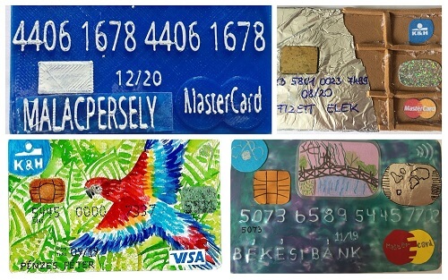 Idén is brillíroztak versenyzőink a kreatív, bankkártya készítő feladatban. Rendkívül izgalmas megoldások érkeztek a zsűrihez. Ugyanis a bankkártya kötelező elemeinek szerepeltetésén kívül szabad kezet kaptak a versenyzők az elkészítés módját illetően. Sokan különböző anyagokat használtak: volt, aki fára, kartondoboz-darabra, szövetre, filcre dolgozott. Sokan laminálták az elkészített rajzot. Sőt volt csapat, amelyik a 3D nyomtató technikáját választotta. Akadtak, akik a kártya chipjét készítették különleges anyagokból, mint például egy kilapított fém ceruzavég, vagy alufólia, esetleg a kártyaszámot és a tulajdonos nevét rakták ki betűtésztából, fabetűkből vagy vitték fel üvegfestékkel. Dolgoztak ezenkívül körömlakkal, illetve mozaiktechnikával is: az elemeket kivágták és újra egyberagasztották. Az alkotások közt előfordult decoupage technika, de még dekorgumis megoldás is. Sőt csapatfotók is kerültek a kártyákra.