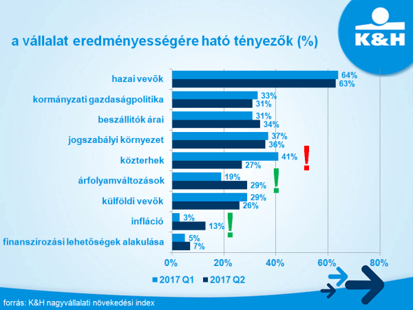 A nagyvállalatok eredményeit meghatározó tényezők sorrendjében ugyan továbbra is a lista végén szerepel a forintárfolyam változása, az infláció és a finanszírozási lehetőségek alakulása, ezek szerepe azonban felértékelődni látszik a nagyvállalatok életében.