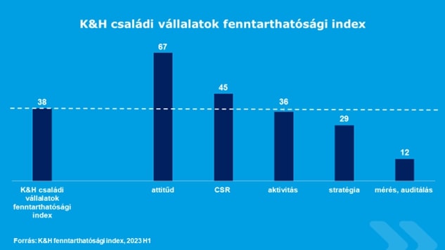 A fenntarthatóság egyelőre még nem központi kérdés a családi cégeknél. Ezt mutatja a K&H családi vállalatok fenntarthatósági indexe, amely a cégvezetés attitűdjéről, aktivitásáról, írott fenntarthatósági stratégia meglétéről, a környezeti lábnyom méréséréről, illetve a cég társadalmi felelősségvállalásáról ad képet. Az index jelenleg 38 ponton áll, ami a közepesnél gyengébb értéknek felel meg. A kutatásból kiderül, a cégeket foglalkoztatja a téma és valamennyire tesznek is ennek érdekében, hiszen hozzáállásuk és a CSR tevékenységük ennél jóval erősebb. Mindezek stratégiai szintű kezelése, valamint az elért eredmények mérése és számszerűsítése viszont még gyenge pontnak számít.