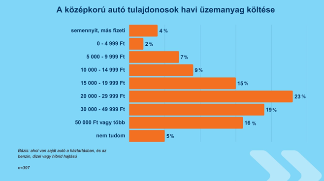 A saját autóval rendelkezők a havi átlagos üzemanyagköltés alapján három nagyobb csoportba sorolhatóak: 20 ezer forint alatt a harmaduk, 20-30 ezer forint között közel negyedük, míg az átlagos 30 ezer forint felett 35 százalékuk költ. Közel tizedük nem tudott nyilatkozni a költés nagyságáról.