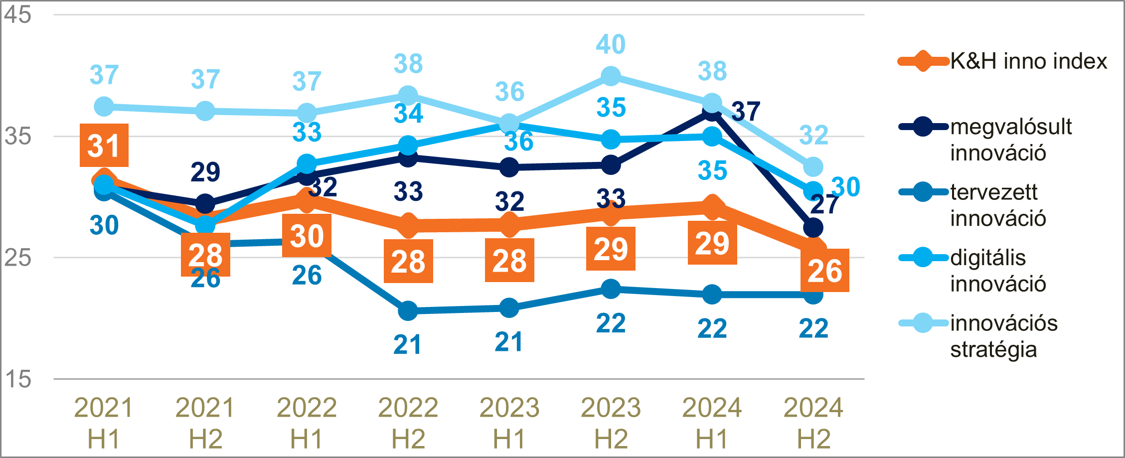 A K&H innovációs index négy alindex alapján méri a vállalatok teljesítményét: megvalósult innováció, tervezett innováció, digitális innováció és innovációs stratégia. Az elmúlt félévben különösen a megvalósult innováció alindexe zuhant mélyre, 10 pontos csökkenést mutatva. Hasonlóképpen, a digitális innováció és az innovációs stratégia is jelentős visszaesést mutatott, 5, illetve 6 ponttal. Bár a tervezett innováció alindex változatlan maradt, ez csak mérsékelt optimizmusra adhat okot a jövőt illetően.