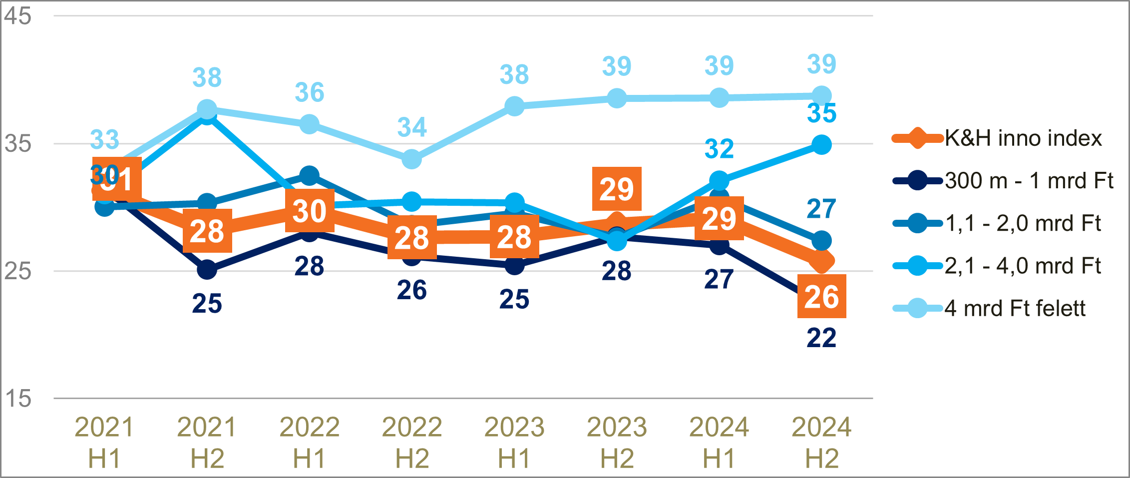 A K&H innovációs index 2024 második félévi eredményei a hazai vállalatok innovációs teljesítményének aggasztó mértékű visszaesését mutatják. Az index, amely a 300 millió forint éves árbevétel feletti magyarországi társas vállalkozások innovációs aktivitását méri, ezúttal mindössze 26 pontos értéket ért el, ami jelentős csökkenés az előző időszakhoz képest, és a mérés elindulása óta mért legrosszabb teljesítmény. A magyarországi cégek innovációs hajlandósága és teljesítménye továbbra is messze elmarad az ideális szinttől egy olyan gazdasági környezetben, ahol a hazai nagy- és közepes vállalatok is elég borúlátóan ítélik meg a jövőt.