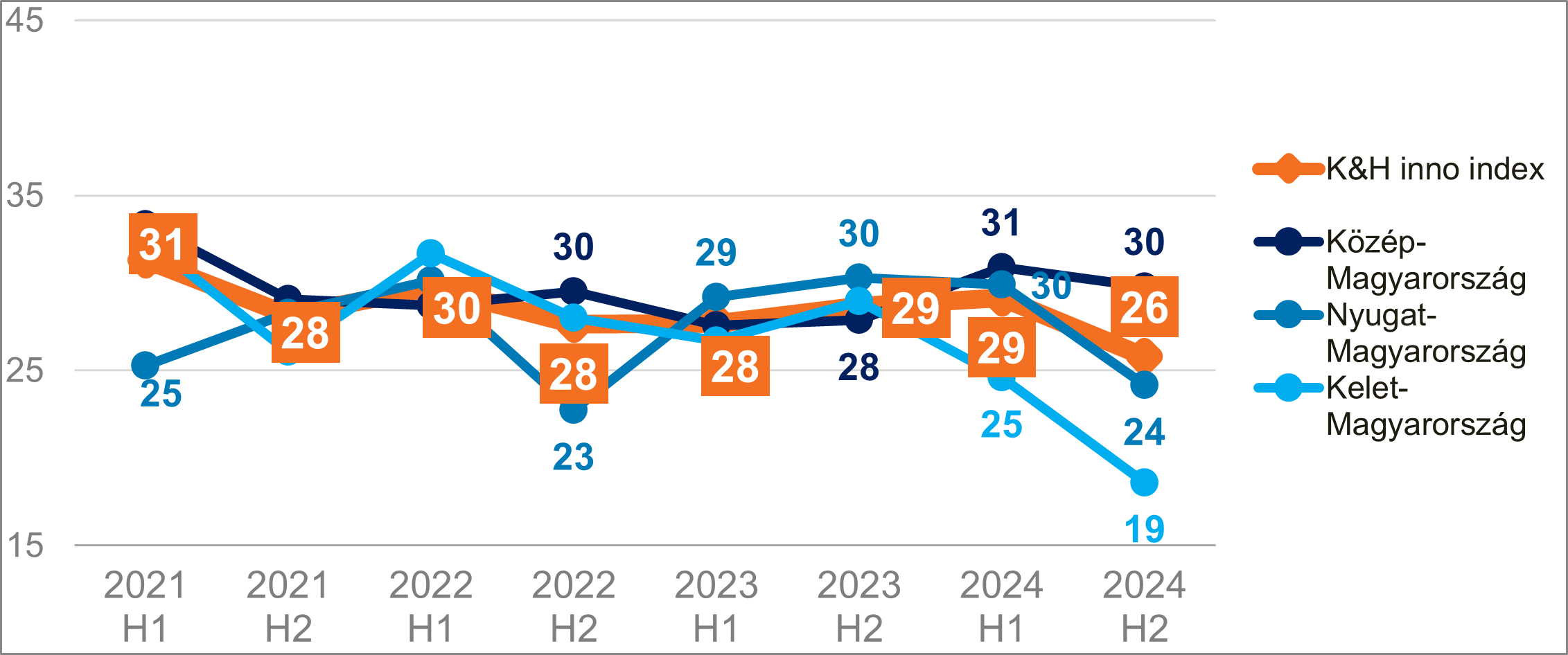 Regionális összevetésben a vidéki vállalatok innovációs indexe jelentősen csökkent. Nyugat-Magyarországon és Kelet-Magyarországon az index egyaránt 6 ponttal esett vissza, 24, illetve 19 pontra. A központi régió vállalatai viszonylag stabilabb teljesítményt mutattak, de itt is tapasztalható némi csökkenés, az index 30 ponton áll.