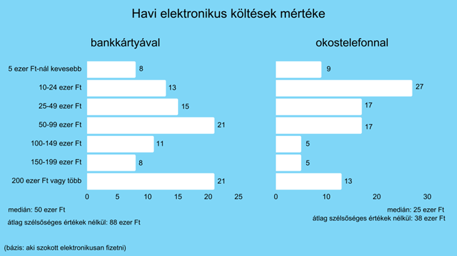 A kutatásból kiderült, hogy a felmérésben résztvevő 19-29 évesek 54 százaléka részesíti előnyben a különböző elektronikus fizetési alternatívákat. Az egy hónapban bankkártyával elköltött összeg átlagosan - a kiugró szélsőértékek nélkül - 88 ezer forint volt. A medián 50 ezer forintra jött ki, ez azt jelenti, hogy az elektronikusan fizető fiatalok fele ennél nagyobb összeget költ egy hónapban, a másik fele pedig ennél kevesebbet.