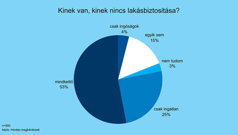 A lakásbiztosítással rendelkezők 53 százalékának az ingóságokra és az ingatlanra egyaránt szól a biztosítása, 25 százalékuknak pedig kizárólag az utóbbira. A részeredmények szerint a harmincas és negyvenes korosztály tagjai elsősorban az ingatlanjukat biztosítják, az ingóságaikat kevésbé. Az ötvenes éveikben járók többségének - 62 százalékának - van mindkettőre biztosítása, míg a másik két korcsoportban 47 és 52 százalékuk mondhatja el ezt magáról.