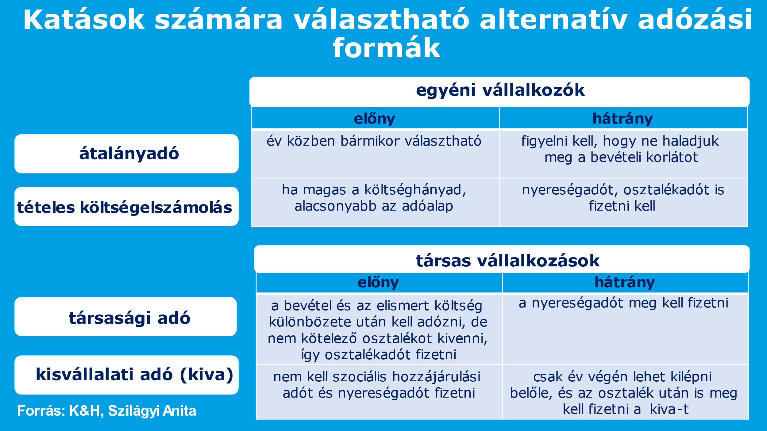 „Aki számára a továbbiakban a kata nem választható, az az átalányadó, a tételes költségelszámolás, a társasági adó és a kiva mellett dönthet. Az, hogy kinek melyiket lehet és érdemes választani, az nagyban függ a várható bevételtől, az elszámolható költségektől és az igénybe vehető kedvezményektől” - összegezte Szilágyi Anita, a K&H szakértői csapatának tagja, a Vállalkozás Okosan alapítója és vezető tanácsadója, ezért oldalukon adókalkulátor is segíti a vállalkozásokat a döntésben.