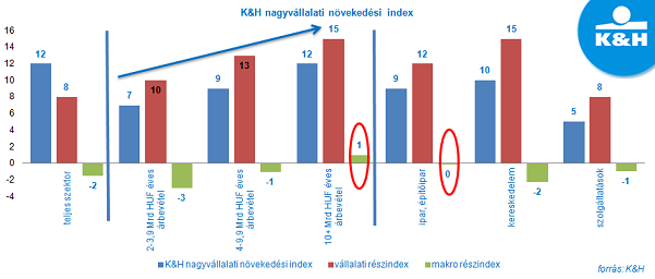 A hazai nagyvállalatok növekedési kilátásait mutató K&H nagyvállalati növekedési index óvatos optimizmust tükröz, jelenleg 8 ponton áll. A várakozások a vállalat méretével párhuzamosan egyre nagyobbak, míg a szektorok közül a kereskedelem látja legpozitívabban a következő egy évet.