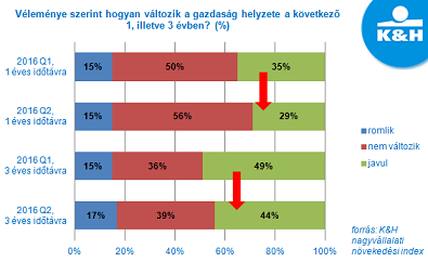 A gazdasági kilátásokat illetően rövid és középtávon egyaránt csökkent a növekedést feltételezők aránya. Míg azonban rövid távon a jelenlegi gazdasági környezet stagnálását feltételezők aránya nagyobb (56%), addig középtávon a javulásban bízók tábora a legnagyobb (44%).