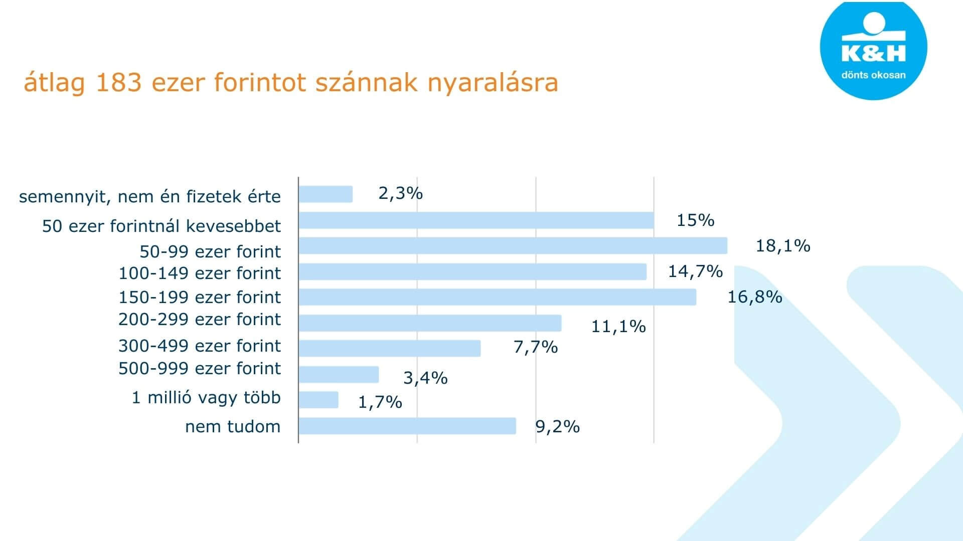 A kutatásból az is kiderült továbbá, hogy a nyaralásra fordítandó összeg éves szinten azoknál csökkent a legkisebb mértékben, akik egyedül tervezik a nyaralást. Ők erre átlagosan 142 ezer forintot szánnak. A kétfős utaknál a 183 ezer forintos átlag négyéves mélypontot jelent, míg a háromfős utaknál a most mért 156 ezer forint az eddigi, 2018 óta mért legalacsonyabb érték, de a négyfős és ötfős utazásoknál is szintén jelentős a visszaesés a rendelkezésre álló büdzsében.