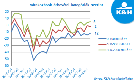 A különböző árbevételű cégeknél a jövőbe vetett bizalom mértéke párhuzamosan növekszik a vállalkozás méretével: jelenleg a mikrovállalkozások várakozásai a legvisszafogottabbak, a kisvállalkozásoké közelít a semleges hangulat felé, a középvállalkozásoké pedig már egy éve a pozitív tartományban van.