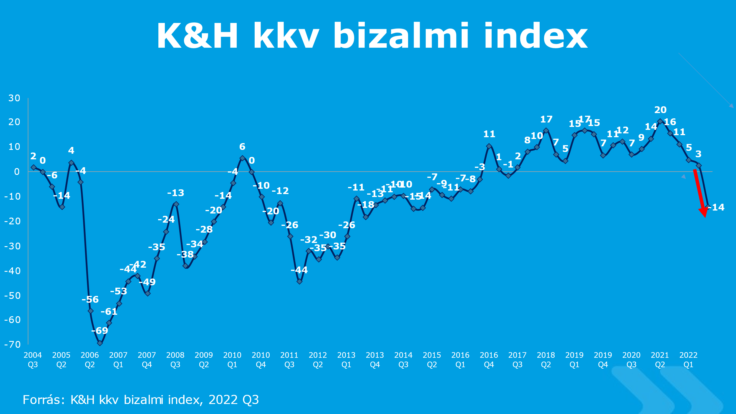 Nagyot esett a harmadik negyedévben a K&H kkv bizalmi index, a magyarországi mikro-, kis- és középvállalkozások következő egy évre vonatkozó várakozásait jelző mutató: 3 pontról -14 pontra süllyedt. „Az elmúlt hónapok hazai- és világgazdasági eseményei erősen megtépázták a kkv szektor jövőbeli kilátásait. Bár ötödik negyedéve csökkenő trendet látunk, a pozitív tartományból még soha nem zuhant ekkorát egy negyedév alatt az index. A mostani elmozdulás a mutató 18 éves történetének is az egyik legnagyobb visszaesése, csak 2015 előtt volt ennél alacsonyabban az index. Igaz, a mostani érték még mindig jóval magasabb a 2011 év végén elért -44 pontos eredménytől és a visszaesés mértéke is kisebb, mint a 2008-as negatív tartományban történt 25 pontos csökkenés. A jelenlegi esés fő oka, hogy a vállalkozások magasabb adóterhekre, negatív pénzügyi eredményre és a munkaerőpiaci helyzet, valamint a versenyhelyzet romlására számítanak” – foglalta össze az eredményeket Rammacher Zoltán, a K&H kkv marketing és értékesítés támogatás vezetője.