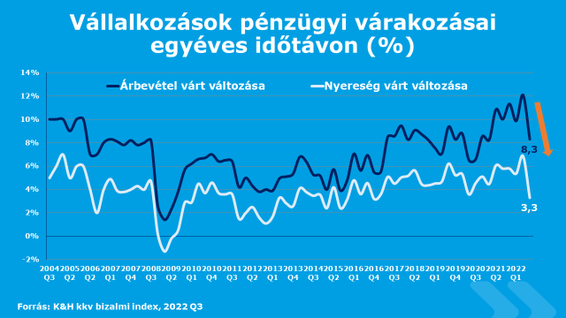 Az előző negyedévekhez képest alacsonyabb árbevétel-növekedésre számítanak a hazai cégek. A mikro-, kis- és középvállalkozások következő egy évre vonatkozó várakozásait vizsgáló K&H kkv bizalmi index kutatás legutóbbi eredményei szerint átlagosan 8,3 százalékos éves árbevétel-emelkedéssel számolnak, ami elmarad az előző negyedévi 12,1 százalékos várakozásoktól. Egy negyedév alatt ilyen mértékű visszaesésre a 2008-as válságot leszámítva nem volt példa az index történetében. „Az elmúlt egy évre jellemző 10 százalék feletti várt árbevétel-növekedés trendje véget ért. Ennek hátterében feltehetően az áll, hogy az egyre magasabb infláció miatt a kkv-k már forgalomcsökkenéssel számolnak. Az MNB legfrissebb előrejelzése szerint ugyanis 13,5-14,5 százalék lehet idén az éves infláció mértéke, ami számottevően csökkentheti a kkv-k reálértékű növekedését, miközben a kiskereskedelmi forgalom hónapról hónapra egyre kisebb mértékben bővül” - mondta el Rammacher Zoltán, a K&H kkv marketing és értékesítés támogatás vezetője.