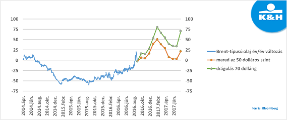 Előretekintve két esetet vizsgáltunk: a narancs vonal a „nem történik semmi izgalmas” verzió, azaz a következő 12 hónapban végig 50 dollár körül mozog majd a kőolaj, míg a kék vonal a „fokozatos emelkedés”-t mutatja, vagyis lassú, minden negyedévben 5 dolláros emelkedés történik, egészen 70 dolláros olajárig.