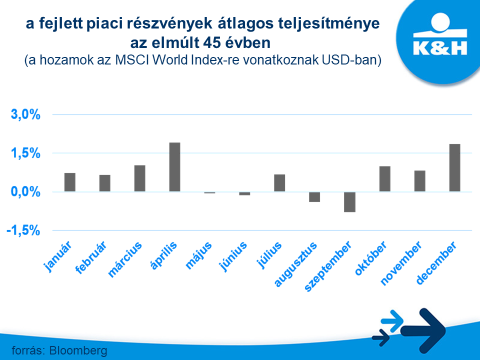 „Ha a múltból indulunk ki, az aggodalom valóban jogos – legalábbis részben. Hiszen, ha visszanézzük az MSCI World Index, a világ egyik legnépszerűbb részvénykosarának elmúlt 45 évére, jól látható, hogy a nyári időszakban tényleg rosszul teljesítettek a részvények. Különösen igaz ez június és augusztus hónapra, hiszen ennél a két hónapnál többet csak szeptemberben lehetett veszíteni a részvényekkel. A legrosszabbul teljesítő hónapok ráadásul nem szétszórtan helyezkednek el az évben, hanem a nyári-ősz eleji időszakra összpontosulnak, felerősítve ezzel a hatást” – mondta el Kovács Mátyás, a K&H Alapkezelő szenior portfólió-menedzsere.