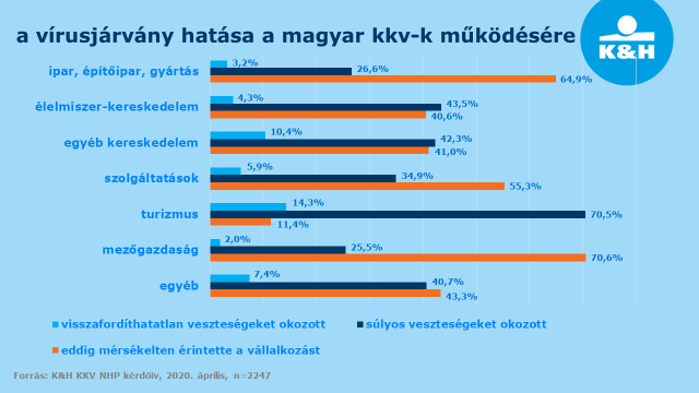 A magyar kkv-k felét mérsékelten, 44 százalékukat azonban nagymértékben érintette a koronavírus – derült ki a K&H ügyfelei körében április közepén folytatott felmérésből. A kár mértékét tekintve jelentős eltérés mutatkozik az egyes ágazatok között. A vírusjárvány egyik legnagyobb vesztese egyértelműen a turizmus: a szektor képviselőinek 85 százaléka számolt be arról, hogy visszafordíthatatlan vagy súlyos veszteség érte a hirtelen leállás következtében. Emellett az egyéb kereskedelem (53 százalék) és az élelmiszer-kereskedelem (48 százalék) érintett leginkább, a legkevésbé pedig a mezőgazdaságban (28 százalék) tapasztaltak komoly gondokat.