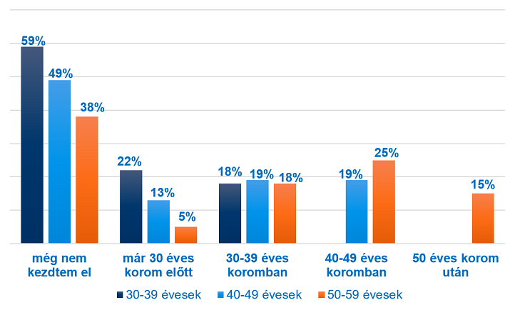 A kutatásból az is kiderül, ki, mikor kezd el félretenni. Bár a halogatók aránya a korral egyre csökken, még így is sokan maradnak nyugdíjcélú tartalék nélkül. A harmincas korosztálynak több mint a fele, a negyveneseknek alig fele, míg az ötvenesek 38 százaléka nem kezdett még hozzá a nyugdíjcélú takarékoskodáshoz.