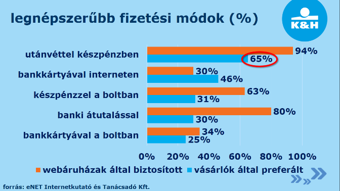 Az online térben magától értetődő lehet, hogy a bankkártyás fizetés a legegyszerűbb, legkényelmesebb és leggyorsabb mód. Ehhez képest az eNET kutatása szerint a vásárlók kétharmada az utánvétes készpénzfizetést részesíti előnyben (65%) és a webáruházaknál is ez az opció a legelterjedtebb (94%), de egyre nő az igény az interneten keresztüli bankkártyás fizetés iránt (46%).