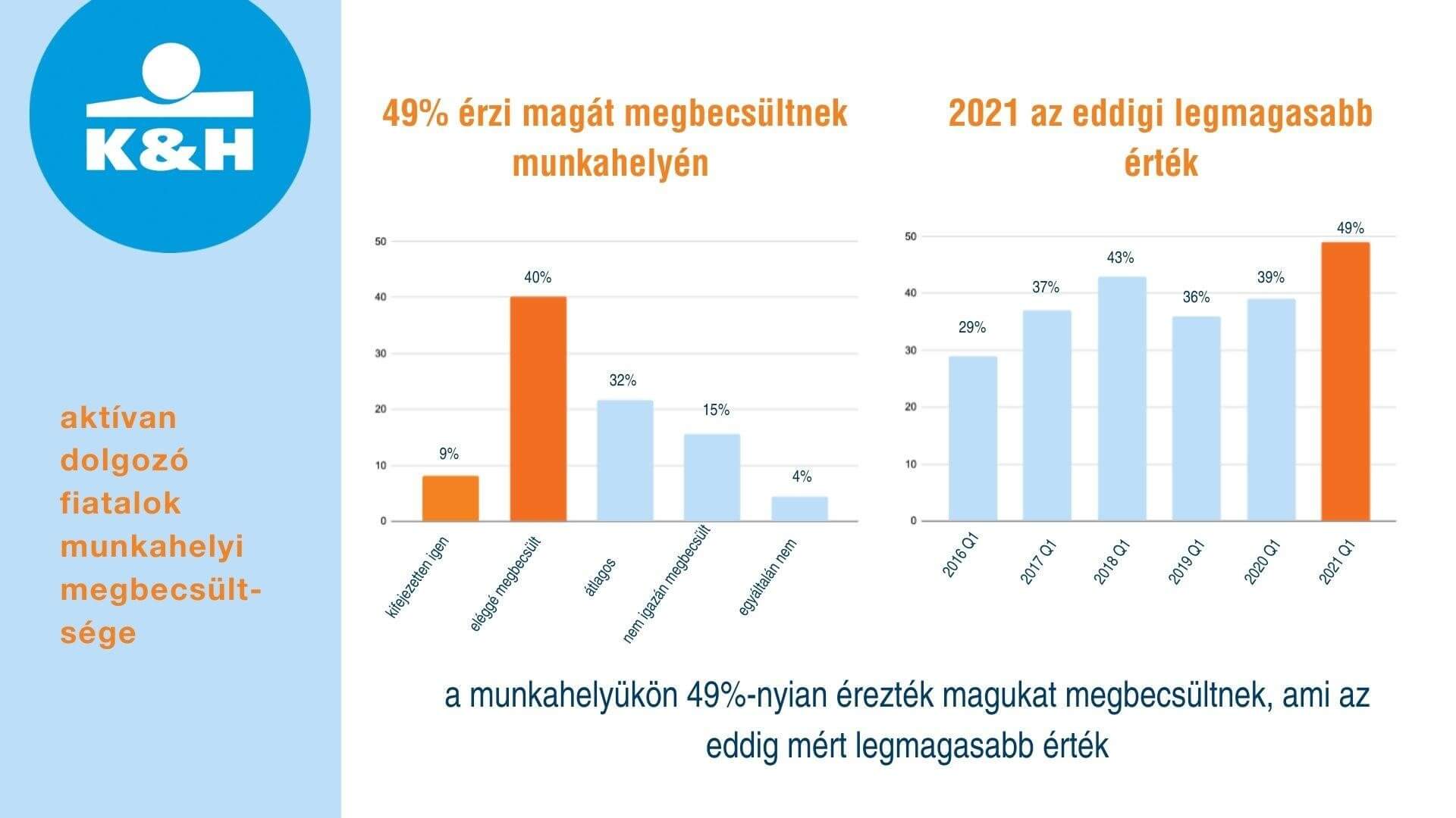A biztos lábakon álló munkahely mellett fontos mérőszám az is, hogy a munkavállalók - jelen esetben a K&H ifjúsági indexében vizsgált 19-29 éves dolgozó fiatalok - mennyire érzik elismertnek magukat. Itt a megkérdezettek 49 százaléka mondta azt, hogy “kifejezetten” vagy “eléggé” megbecsültnek érzi magát. Ez a 2012 óta tartó kutatás eddigi legmagasabb értéke. Tavalyi év azonos időszakában ez 39 százalék volt, de az előtte való időszakhoz viszonyítva is (például 2016-hoz vagy 2019-hez képest) sokkal inkább érzik magukat megbecsültnek a munkahelyükön a fiatalok.