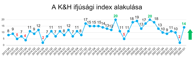 Rendkívül kedvező változást hozott a 2023-as első negyedév: a K&H ifjúsági index értéke +14 pontra emelkedett az előző év utolsó negyedévében mért rekord alacsony szintről, mely a 10 év alatt a legnagyobb mértékű változás is egyben. Immár tíz éve minden negyedévben elkészül a pénzintézet kutatása, amely a 19-29 év közötti fiatalok anyagi, pénzügyi, munkaerőpiaci helyzetét, az élettel való jelenlegi elégedettségét és a jövőbeli várakozásaikat vizsgálja.