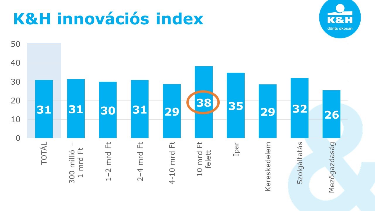 Első alkalommal összességében a közepesnél gyengébb teljesítményt mutat a K&H innovációs indexe, amely az idei első félévben 31 ponton zárt. A vállalatméret szerinti bontás alapján a legnagyobb - 10 milliárd forintot meghaladó árbevételű - vállalatok érték el a legjobb eredményt, 38 ponttal. A leginnovatívabb ágazatok közé tartozik az ipar és a szolgáltató szektor, a mezőgazdaság az ágazati bontás szerint a sor végén foglal helyet.