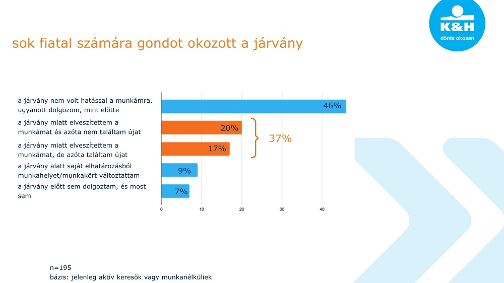 A kutatás szerint a fiatalok közel felét, 46 százalékát nem érintette a járvány, ők ugyanott dolgoznak, mint a pandémia magyarországi megjelenése előtt. 9 százalékos azoknak az aránya, akik saját döntésből fakadóan váltottak munkahelyet, míg 7 százaléluk a járvány előtt és után sem volt állásban.