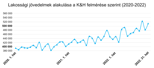 Magyarországon a legfrissebb elérhető hivatalos adatok szerint a magas infláció miatt a vásárlóerőt meghatározó reálbérek a negatív tartományba kerültek. A múlt év egészét nézve a reálbérek mindössze 2,6 százalékkal nőttek, decemberben több mint 5 százalékkal csökkentek, idén januárban viszont már 7,6 százalékos süllyedést mutattak, amire másfél évtizeddel ezelőtt volt utoljára példa. A lakosság jövedelmi helyzetét a K&H saját, rendszeresen elvégzett felmérésén keresztül is monitorozza. Ennek keretében a 20-65 éves, városban élő, legalább középfokú végzettségű lakosság köréből heti rendszerességgel 100 főt kérdeznek meg, mely minta nem, kor, régió, településnagyság szerint reprezentálja a népesség ezen részét. A válaszadók többek között beszámolnak az anyagi helyzetükről is, beleértve azt is, hogy a háztartásukban mekkora az összjövedelem, valamint a megtakarítás. Az adatok szerint a megkérdezetteknél a háztartás teljes átlagos jövedelme - amely a fizetés mellett az egyéb jövedelmeket is tartalmazza - éves összevetésben 10 százalékkal 494 ezer forintra nőtt a múlt év utolsó negyedévére.