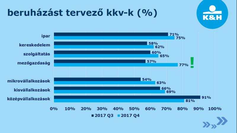 Sokéves csúcson van a kkv-k beruházási hajlandósága, jelenleg ugyanis háromból két cégvezető tervez valamilyen fejlesztést a követő egy év során – derül ki a K&H kkv bizalmi index kutatás adatiból. A célokat tekintve a hatékonyságnövelés került az élre, megelőzve a sokáig első helyen levő informatikai beruházásokat. Az árbevételt tekintve a középvállalkozásoknál, az ágazatokat nézve a mezőgazdasági cégeknél várható leginkább beruházási boom.
