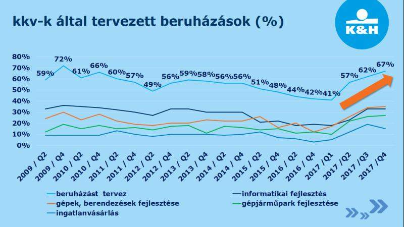 Tovább emelkedhet a nemzetgazdasági beruházások volumene, hiszen egy éve folyamatosan javul a hazai vállalkozások beruházási kedve. „Jelenleg a kkv-k kétharmada, 67%-a gondolja úgy, hogy valamilyen fejlesztésbe kezd az előttünk álló egy évben. Ez igen látványos előrelépés az egy évvel ezelőtti értékhez képest, amikor a cégek mindössze 41%-a vélekedett így. A javulás mindenképpen figyelemre méltó, hiszen utoljára 2010-ben volt hasonlóan magas szinten a cégek beruházási kedve. A kiskereskedelmi forgalom és a lakossági fogyasztás dinamikus bővülése mindenképpen hozzájárulhat a tervezett beruházások bővüléséhez” – részletezte a K&H kkv bizalmi index legutóbbi eredményét Kovács Viktor Zoltán, a K&H kkv marketing főosztály vezetője.
