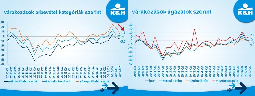 A bizalom minden árbevétel-kategóriában és – a mezőgazdaság kivételével – minden ágazatban gyengült. A középvállalkozások várakozásai romlottak leginkább, 18-ról 4,5 pontra süllyedt, ennek ellenére továbbra is ők a legoptimistábbak. A kisvállalkozások bizalma szintén a pozitív tartományban, 2 ponton áll, míg a mikrovállalkozások hangulata a negatív sávban, -5,5 ponton van. Az ágazatok közül az agrár cégek hangulata a legjobb (10 pont), míg az ipar és a szolgáltató szektor inkább várakozó állásponton van (0 és -1 pont). Jelenleg a kereskedelmi cégek bizalma a legalacsonyabb (-7 pont), ami feltehetően összefüggésben van a felméréskor meglebegtetett, kereskedelmi vállalkozásokra vonatkozó új szabályozással.