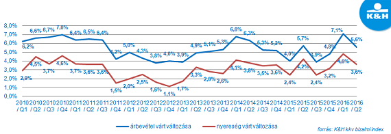 A profitkilátásokat tekintve a vállalkozások túlnyomó többsége (84%) növekedést feltételez a következő egy évben, ugyanakkor annak mértéke jelentősen, 4,8%-ról 3,6%-ra mérséklődött. „Jelenleg minden árbevétel-kategóriában és iparágban szerényebb eredményre számítanak az év elejéhez képest. A csökkenés ellenére ez esetben is a 100-300 millió forint éves árbevételű vállalkozások, az ágazatok közül pedig az ipari cégek várnak átlag feletti, 3,8%-os, illetve 4,6%-os eredmény-növekedést” – mondta el a szakember.