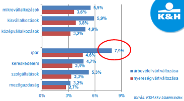 A mikro-, kis- és középvállalkozások általában igen eltérő mértékű bevétel-növekedést várnak, most azonban egységes képet mutat a szektor: a kisvállalkozások átlag feletti, a mikro- és középvállalkozások átlag alatti bővüléssel számolnak. A különböző ágazatok közül az ipari cégek pénzügyi várakozásai a legkedvezőbbek, hiszen 7,9%-os növekedést valószínűsítenek. Ezzel szemben a többi iparág átlag alatti bővülést vár.