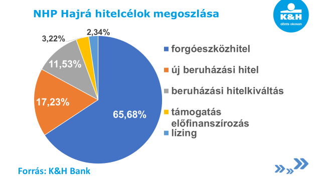 Aktív szerepet vállal a K&H Bank az NHP Hajrá hitelezésben. Áprilisi indulása óta ugyanis a pénzintézet több mint 173 milliárd forint értékben közel 1500 szerződést kötött. A pénzintézet által jóváhagyott hitelek jelentős része Észak-Magyarországhoz, illetve az alföldi régiókhoz köthető. Az ágazatok közül az agrárium számított a legaktívabbnak a hitelfelvételben, míg a települések között Debrecen, valamint Miskolc regionális üzleti központok emelkedtek ki.