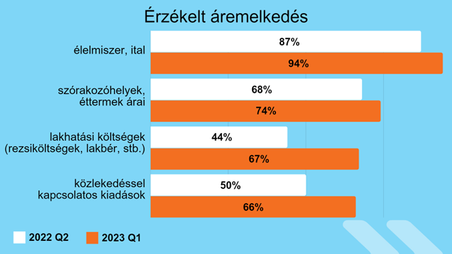 Az élelmiszereknél a megkérdezettek 94 százaléka mondta azt, hogy az elmúlt egy év alatt kifejezetten jelentős volt az áremelkedés. A szórakozóhelyek, éttermek esetében 74 százalékuk tapasztalt komoly drágulást. A lakhatási költségek számottevő emelkedéséról számolt be az érintettek 67 százaléka. Mindhárom esetben növekedés következett be az egy évvel korábbi helyzethez képest.