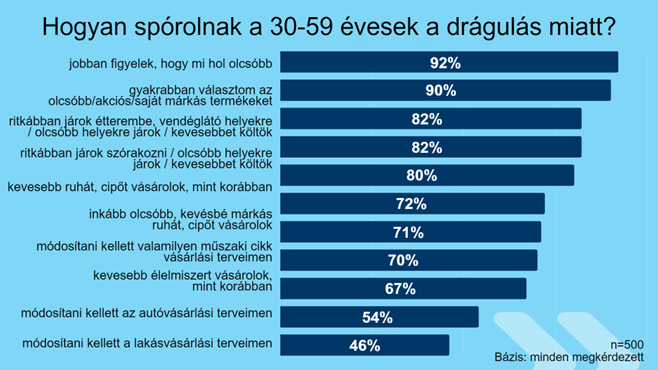 A magyarok 90 százaléka mostanában gyakrabban vásárolja meg az élelmiszerláncok saját márkás termékeit vagy a hasonló termékek közül az olcsóbbat, mint korábban. A nők körében az átlagosnál magasabb, 94 százalék ez az arány, a férfiaknál ugyanez 86 százalékos. Hasonló az eltérés a községekben, illetve a fővárosban élőknél is.