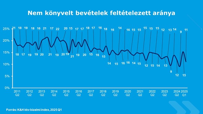 Az elmúlt negyedévben tapasztalt, sokszor kiszámíthatatlan gazdasági folyamatok dacára is lendületet tudott venni a gazdaság fehéredési folyamata. A K&H kkv bizalmi index 2025 első negyedéves kutatási adatai alapján jelentős mértékben, 4 százalékponttal csökkent a nem könyvelt bevételek aránya, a kkv vezetők megítélése szerint, így a mutató jelenleg 11 százalékon áll. 2015 azonos időszakában még 20 százalékra becsülték a cégvezetők a könyvelési látenciát, de az elmúlt 10 évben fokozatosan csaknem felére csökkent ez az arány.