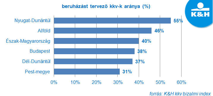 A beruházási hajlandóság a cég területi elhelyezkedésétől is nagymértékben függ. Míg Nyugat-Dunántúlon a cégek több mint fele (55%) tervez fejlesztést, addig Pest megyében mindössze 31% ez az arány. „A középvállalkozások, az ipari szektor és a Nyugat-dunántúli régióban elhelyezkedő cégek az átlagot bőven meghaladó beruházási szándéka bizalomra adhat okot a jövőre nézve, és akár húzóerőt is jelenthet a többi vállalkozás számára” – tette hozzá a szakértő.
