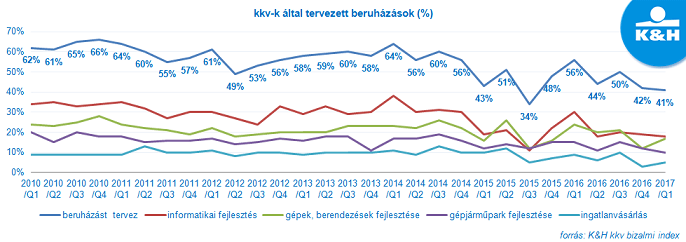 A hazai vállalkozások egy évre előremutató várakozásait jelző K&H kkv bizalmi index eredménye szerint alacsony a fejlesztésben gondolkodó cégek aránya. „Jelenleg stagnál a kkv-k beruházási kedve, tízből 4 vállalkozás készül fejleszteni az előttünk álló egy évben. Az NHP kifutásával feltehetően megtorpan a cégek beruházási hajlandósága, de a fogyasztás folyamatos bővülése, az uniós források és a még két évig elérhető uniós garanciaprogram (COSME) mind hozzájárulhat a beruházások jelenlegi szinten tartásához vagy akár emelkedéséhez” – mondta el Kovács Viktor Zoltán, a K&H kkv marketing főosztály vezetője. „A cégek legnagyobb része – az előző negyedévhez hasonlóan – informatikai beruházásokra készül (18%), miközben a gépek, berendezések fejlesztését tervezők aránya 12%-ról 17%-ra ugrott, a gépjárműpark korszerűsítésére pedig minden tizedik kkv készül” – részletezte az eredményeket a szakember.